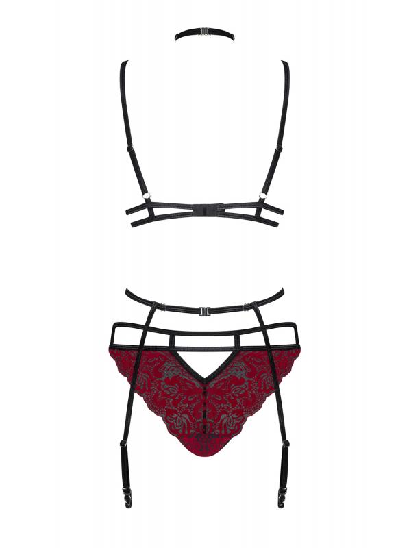 Seduce your partner in this striking 3-piece suspender set! The set includes a bra with soft cups, a suspender belt with halter neck and a matching sexy thong. The straps are widely adjustable and the set is comfortable thanks to the elastic material. Complete the look with a pair of matching stockings!